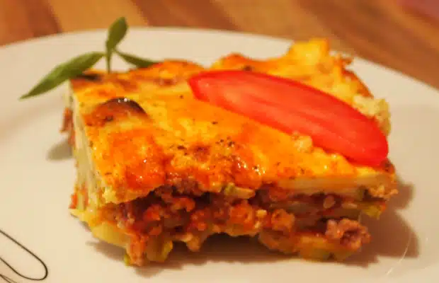 Печем, докато горният слой придобие златист цвят. От останалите продукти приготвяме заливката. След като залеем с нея мусаката, връщаме отново във фурната и печем, докато се зачерви. Украсяваме мусаката с листа свеж босилек при сервиране.