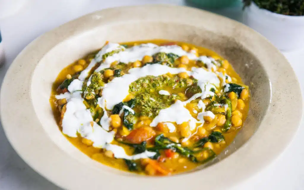 Сервирайте задушения нахут в дълбока чиния, поръсен със сос зуг и кисело мляко.