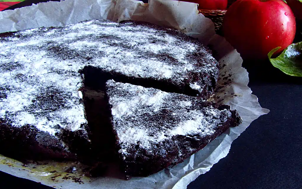 Получава се леко лепкаво тесто с консистенция на тесто за кекс (може би една идея по-рядко). Изсипете тестото в тава, покрита с хартия за печене. Печете около 30-35 минути или до суха клечка. Имайте предвид, че сладкишът се получава леко влажен.