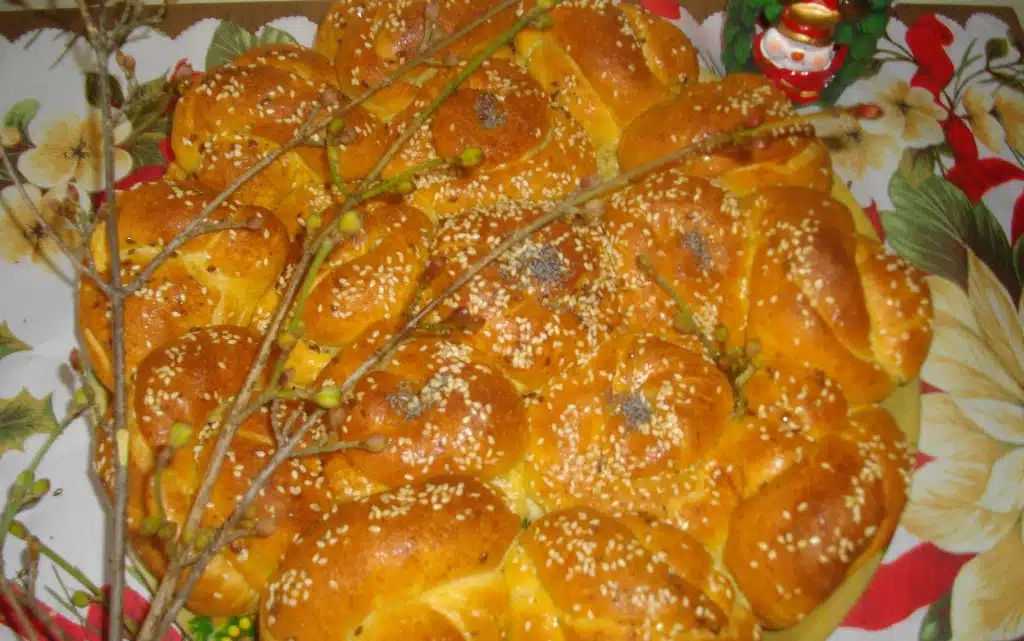 Останалото се нарязва на триъгълници, които се нареждат по края на тавата едно с връх навън, едно с връх навътре. Намазваме с разбит с малко олио жълтък. Печем в загрята фурна на 170 градуса 40 минути до златиста коричка. Изважда се, намазваме с краве масло и покриваме с кърпа да омекне.