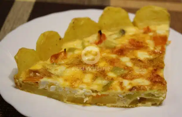 Чушките нарязваме на ситно. Смесваме ги с натрошеното на едро сирене. Прибавяме и яйцата. Получената смес изсипваме върху картофите. Печем за около 20 минути. Поднасяме на триъгълни парчета.