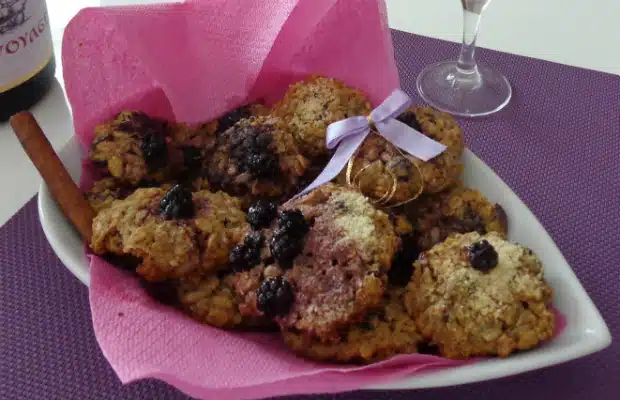 Омесваме до постигане на хомогенна смес и оставяме в хладилник за 20 мин. Изваждаме и с мокри ръце оформяме бисквитите, като поръсваме отгоре с кокосовите стърготини и глазираме внимателно, така че да не се разтече сладкото от къпини.