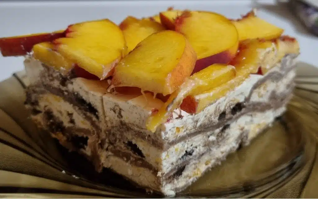 Прибираме я в хладилника за 1 нощ, а след това я декорираме с нарязани праскови или нектарини. Приятен завършек на уикенда или едно страхотно начало на седмицата. 😉