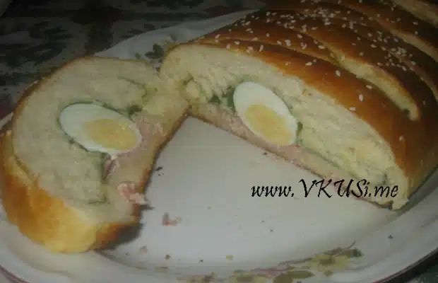 От изброените продукти се замесва меко тесто. Оставя се за 30-40 минути да втаса. Разточва се на правоъгълна кора и в средата се нарежда пушеното месо (слайс) и сварените яйца, а отгоре се поставят накъсаните листа спанак и накрая се настъргва обилно с кашкавала.