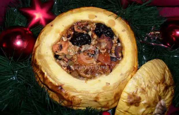 Започнете да я пълните, като слагате по малко плодове от различни видове, леко счукани орехови ядки, плодове и т.н., докато я напълните до горе. Сипете рома и затворете с горната част на тиквата.