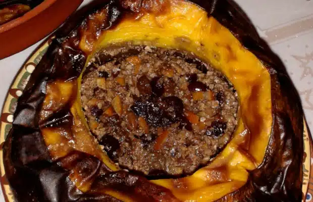 Тиквата се измива, изрязва се от към дръжката малка част като капаче. Почиства се отвътре, махат се семките и влакната и се намазва хубаво с мед. Стафидите се накисват в рома и се оставят за няколко минути да омекнат.