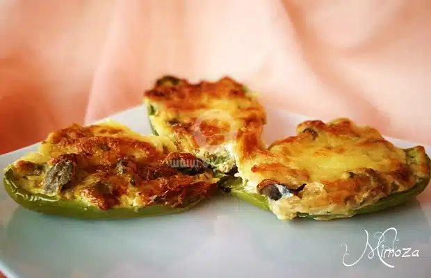 Чушките се измиват, разрязват се надлъжно на две и се почистват от семките. Нареждат се върху застлана с хартия за печене тава и се пълнят с плънката.