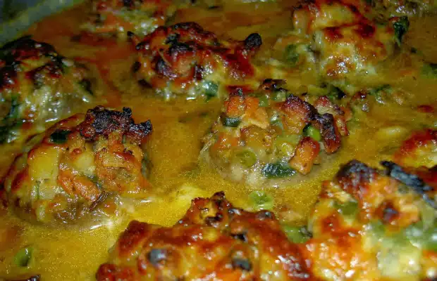 Гъбките се пълнят с тази смес, поливат се с останалата половина от маслото и се запичат до полуготовност. Десет минути преди да приключите печенето, се изваждат от фурната и се наръсват с настъргания кашкавал. Дозапича се до златисто.