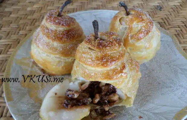 Намажете с разбирия жълтък тестото около крушите. Подредете ги в тавичка за печене, покрита с оризова хартия. Печете ги в загрята фурна на 200 градуса, докато тестото стане златисто. Поръсете с пудра захар и сервирайте топли.