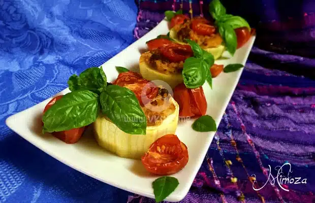 Добре позната рецепта, с чиято презентация реших да експериментирам. Обикновено в този тип ястия, тиквичките се разрязват по дължина като лодки. Но този път реших да сменя визията. Получиха се страхотни кокетни хапки. 🙂