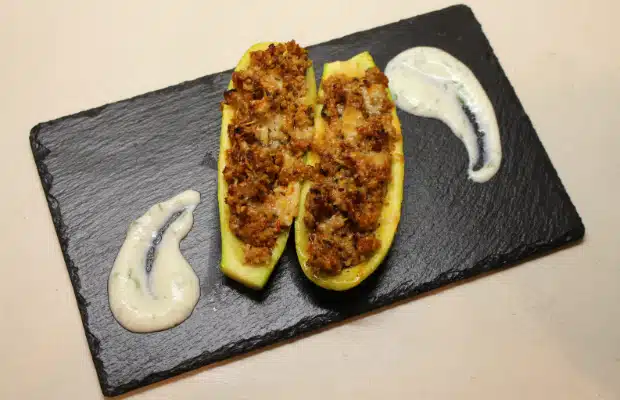 Приготвяме млечен сос – пасираме зелените подправки с малко сол и зехтин и така полученото песто добавяме към млякото. Поднасяме с тиквичките.