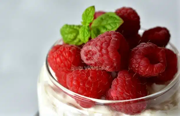 * Ако искате да приготвите десерта предварително, тогава ще е необходимо да желирате и крема, а след неговото стягане, да покриете и малините с тънък слой желатин, за да се запазят свежи плодовете до поднасянето.