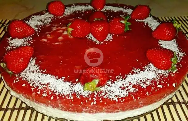 Накрая украсете по желание с ягоди и стърготини от кокос, махнете ринга внимателно, като преди това минете с нож около стените, за да я отлепите и нарежете на парчета.