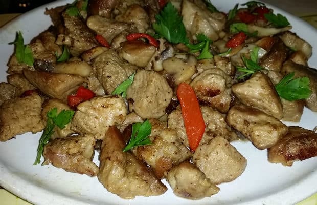 Трябва да остане само на мазнина и да започне да се пържи отново, тогава добавете нарязаните гъби и червената чушка. Гответе до златист цвят на гъбите и месото, накрая поръсете със сол, черен пипер и малко магданоз.