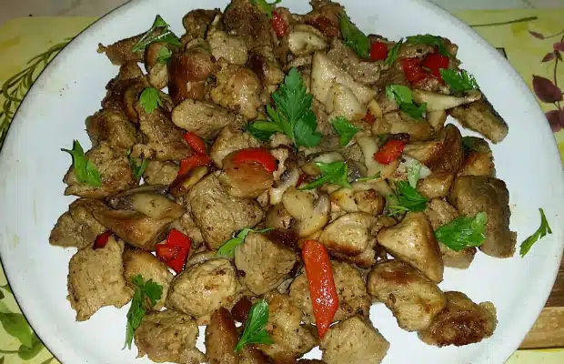 Трябва да остане само на мазнина и да започне да се пържи отново, тогава добавете нарязаните гъби и червената чушка. Гответе до златист цвят на гъбите и месото, накрая поръсете със сол, черен пипер и малко магданоз.