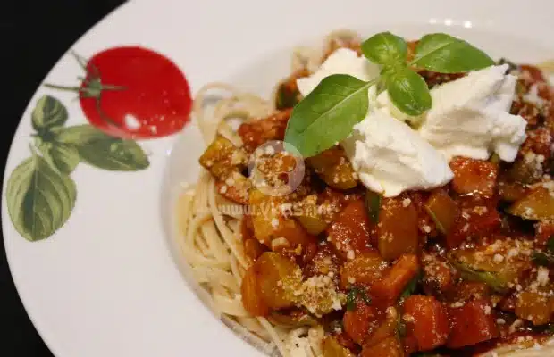 Днес ви предлагам рецепта за паста с рикота. Тя, с нейната мекота и ефирност, чудесно подчертава свежестта на тиквичките в тази рецепта и омекотява доматения сос. Съчетава се чудесно със сухо и полусухо вино.