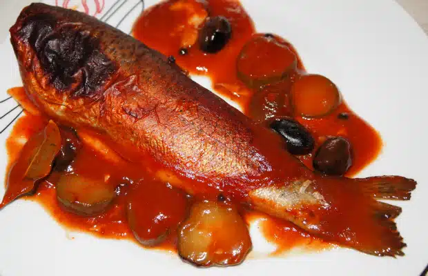 Тавата се намазва с олио. Поставят се двете риби, предварително поръсени със сол и черен пипер. Доматеното пюре се размива с вода и с него се залива рибата.