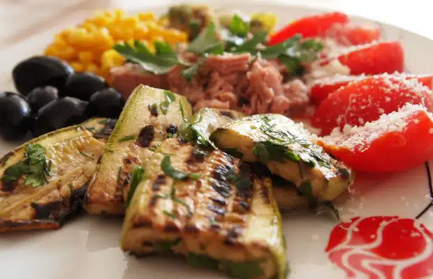 Тиквичките и чушките се изпичат на грил тиган и се мариноват в смес от зехтин, чесън и копър поне за няколко часа. Подреждаме всички продукти в подходяща чиния. Доматите се поръсват с пармезана. По желание върху рибата изцеждаме резен лимон.