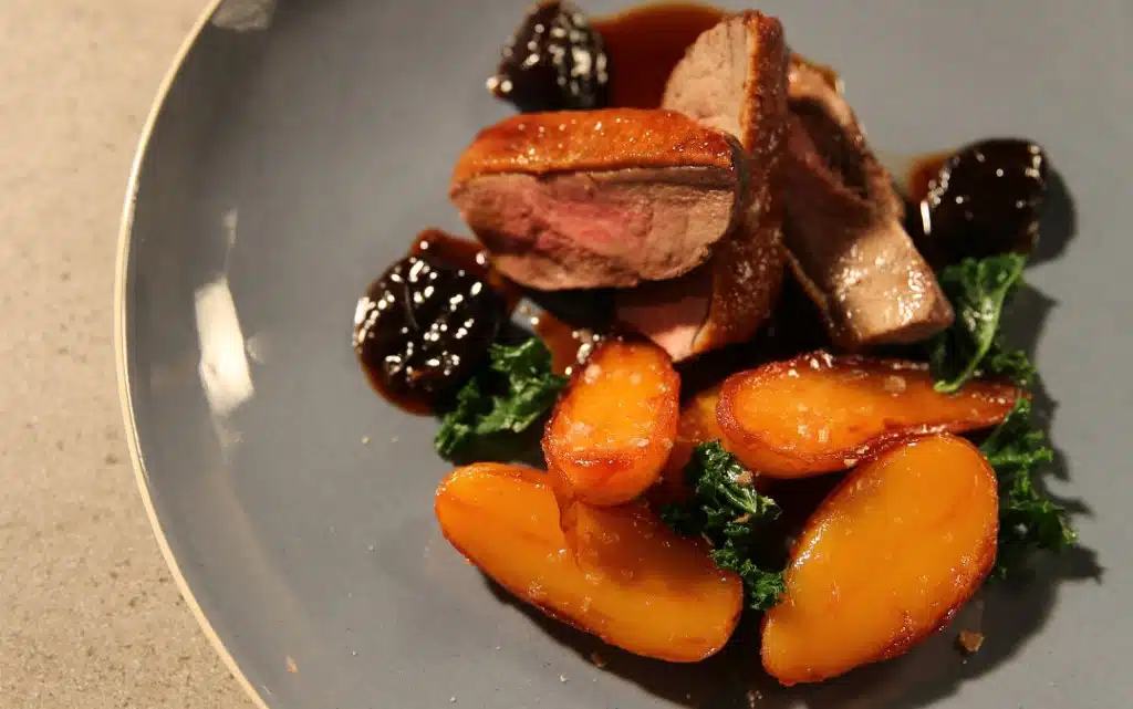 Отпочиналото месо разрежете на две парчета. В чиния подредете бланширан кейл и карамелизирани картофи върху него. До тях поставете месото, сини сливи и полейте със сос.