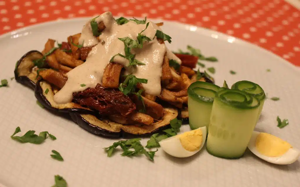 Приготвяме соса като към разбитото кисело мляко добавяме лимонов сок, сусамов тахан, сол и черен пипер. Поднасяме като върху канапе от шайбите патладжан поставяме половината месо, а отгоре заливаме обилно със сос. Поръсваме малко нарязан магданоз за свежест. Приятен апетит!