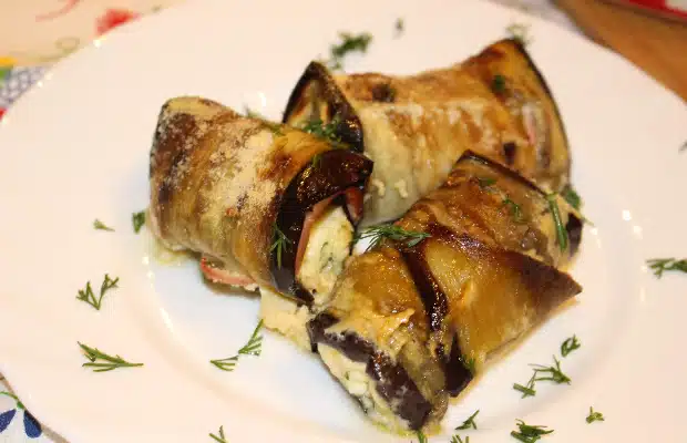 Приготвяме пълнежа като натрошеното сирене смесваме с яйцето, нарязания магданоз и каперсите. Върху всяка филийка патладжан слагаме половин резен шунка, малко плънка и завиваме на руло.