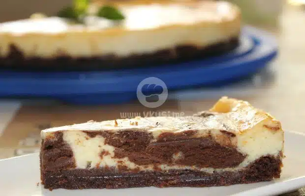С лъжица поставяме от шоколадовата смес върху бялата и леко разбъркваме, за да получим интересни шарки. Печем в предварително загрята фурна на 170-180 градуса за около 40 минути. Сладкишът добива лека кафеникава коричка отгоре. Добре е плавно да го изстудим. Най-добре това се получава, като го оставите в изключена фурна с отворена врата. След това охлаждаме за няколко часа в хладилник.