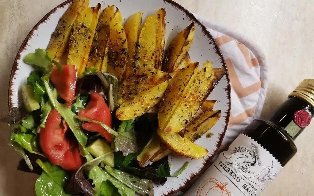 Обелваме картофите и ги нарязваме на „лодки“. Нареждаме ги в тава с хартия за печене едно до друго, така че да не се докосват. Заливаме с двете мазнини и поръсваме с подправките. Печем за около 40 минути на 200 градуса с вентилатор.