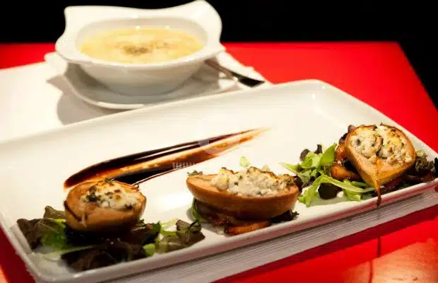 Разтваряме бульон в гореща вода. Издълбаваме крушите. Нареждаме бекона в тавичка. Натрошаваме сиренето в купа, добавяме мащерка, ситно нарязан лук и магданоз. Сипваме малко зехтин и разбъркваме. Със сместа пълним крушите. Нареждаме ги върху бекона, намазваме с мед и печем във фурната.