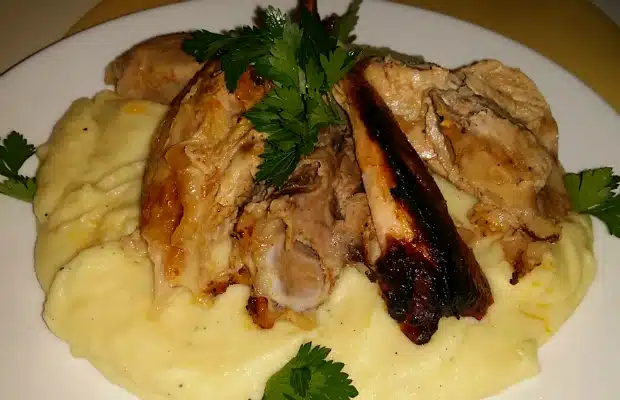 Количеството на млякото зависи от картофите, някои поемат повече мляко, други по-малко, затова си пригответе около 300 мл и сипвайте до желаната гъстота. Поднесете месото върху канапе от картофеното пюре.