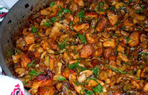 Добавете нарязаните на филийки гъби, отново разбъркайте и печете до готовност на гъбите. След като те омекнат и започнат да се запържват, добавете зелените подправки нарязани на ситно, сол на вкус и поръсете с червен пипер.