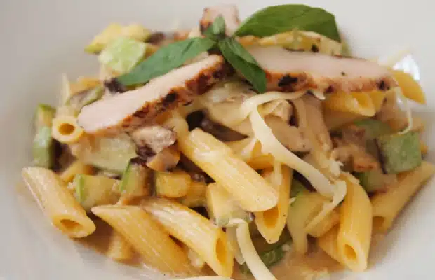 Сваряваме пеннето в подсолена вода и изцеждаме добре. В това време запържваме нарязаните на кубчета тиквички в мазнина. Добавяме течната сметана и останалото песто. Разбъркваме добре. Слагаме пеннето в тигана, като добавяме и пилешките филенца. Сервираме като поръсваме с настърган кашкавал. Украсяваме с листа пресен босилек.