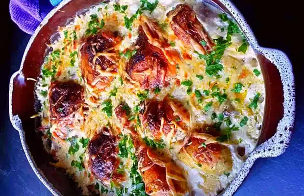 Опитах се да направя нещо подобно на пиле „Жулиен“, но пилешкото оставих с костта и ползвах бутчета. Получи се голяма вкусотия и ми хареса повече от жулиен с пилешко филе.