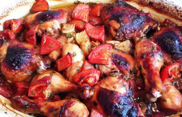 Първо се почистват и измиват всички продукти. Пилето се транжира, ако е необходимо, на порции. Доматите и лукът се режат на едри кубчета, а чесънът – на две. Магданозът се реже на не много ситно.