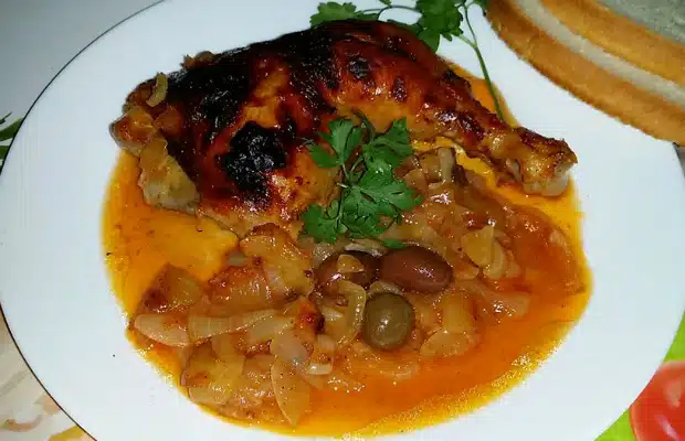 Лукът се почиства и нарязва на полумесеци. Бутчетата се овкусяват със смес от кетчупа, подправката за пиле, черен и червен пипер, мащерка и риган.