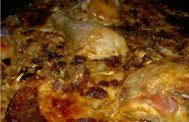 В тенджера се загрява олиото и в него се запържва зелето заедно с доматите и червения пипер. След като се оцвети и поомекне зелето, се прибавя пилето, нарязано на порции, солта и водата. Всичко се оставя да ври на слаб огън докато месото си промени цвета. Прибавят се черният пипер и дафиновите листа и се изсипва в тава. Пече се на 180 градуса до готовност.
