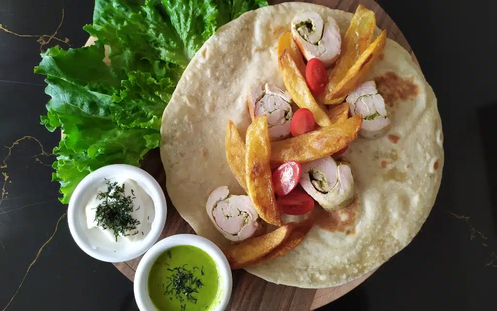 Ефектът на този начин на приготвяне на картофите е, че поемат малко мазнина, но стават хрупкави и вкусни като пържените. Ако завиването на роле ви се струва сложно, може да мариновате пилешкото в магданозеното песто, да го нарежете на парченца и да го приготвите на плоча или тиган като пилешко шишче.
