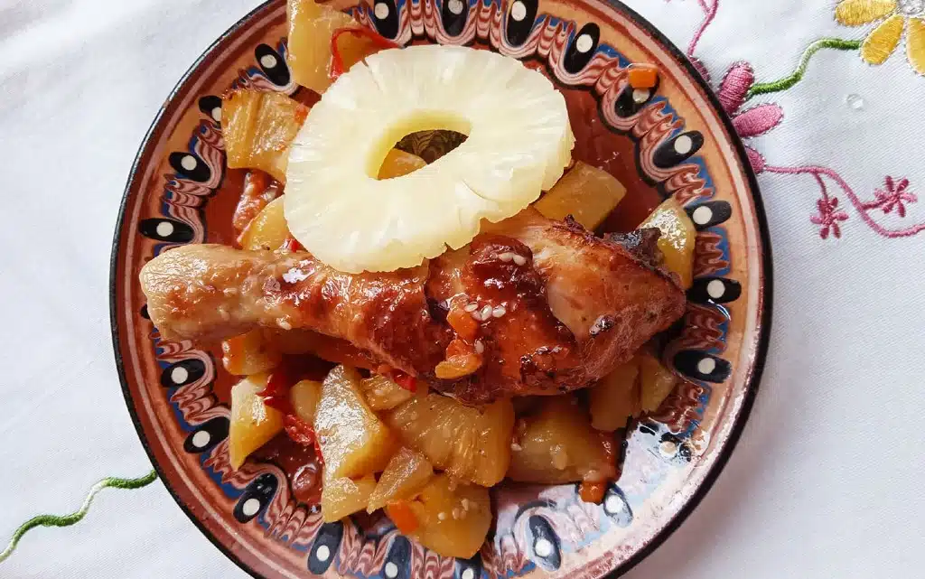 Поставете парчетата пиле, картофи, нарязаната сладка чушка и ананас върху хартията за печене и подправете със соса равномерно. При нужда добавете вода или бульон.