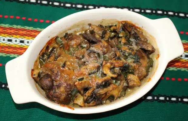 Запържваме нарязания на ситно лук, докато се задуши добре. Добавяме и гъбите, нарязани на едро и задушаваме и тях. Изваждаме ги и в същата мазнина запържваме дробчетата.
