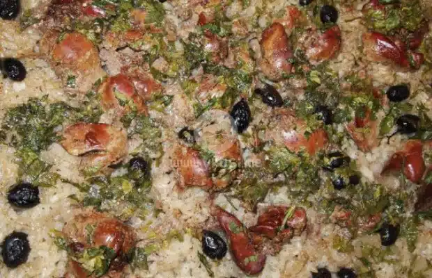 Запържваме лука в нагрята мазнина и след като се зачерви добавяме маслините. След 2-3 минути слагаме оризът, а след това добавяме подправките и малко вода, в която сме разтворили бульона. Оставяме да ври около 5 мин. и сваляме от котлона.