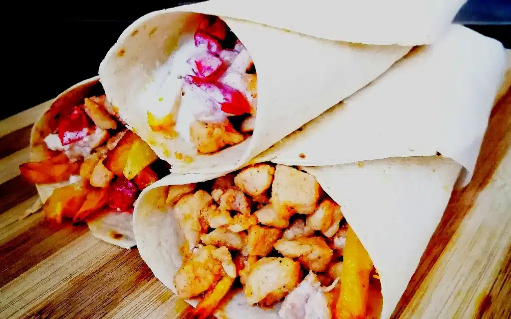 Накрая дюнерите се заливат с млечния сос. Тортилята се навива на руло и се поднася.