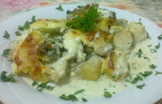 Полуготовите картофи, броколите и месото се поставят в тава, заливат се със сметановия сос и отгоре се настъргва кашкавалът. Ястието се запича в предварително загрята до 200 градуса фурна за около 20-30 минути.