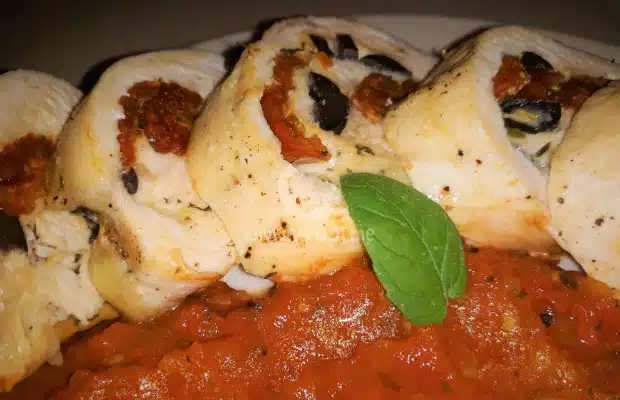 Овкусете пилето с черен пипер и сол и от двете страни. Сложете филето с гладката страна отдолу и започнете да подреждате в единия му край продуктите – сушени домати, маслини, кашкавал. Поръсете с малко мащерка и започнете внимателно да завивате пилето на руло. За да е по-стабилно, може да го захванете с няколко клечки за зъби.