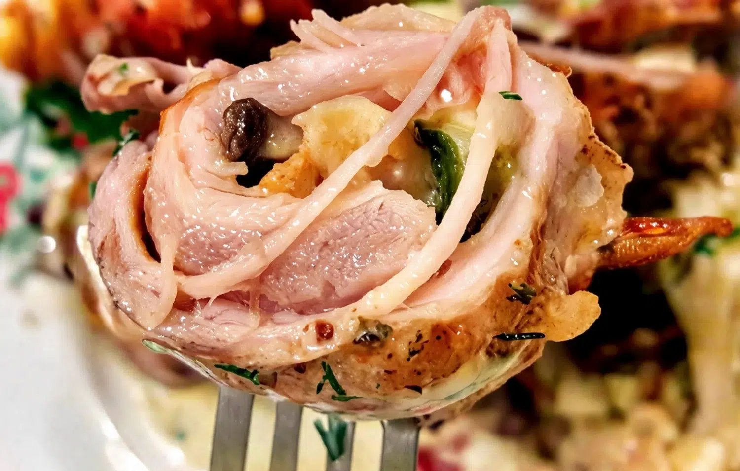 Върху всяко парче филе се разпределя от плънката. Завива се на руло и се закрепва с клечка за зъби или шишче.