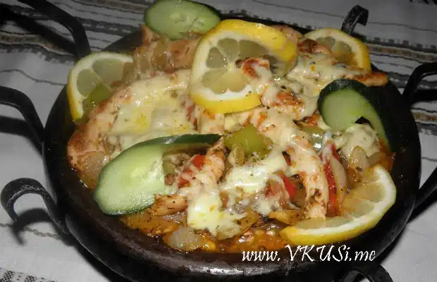 Загряваме сача на котлона и изпържваме пилешкото филе нарязано на кубчета. След като се изпържи, изваждаме филето и слагаме всички зеленчуци, нарязани на по едро да се задушат. Щом станат почти готови, към тях се прибавя отново месото и хубаво се разбърква. Върху всичко се поръсваме настърган кашкавал. Украсяваме с лимон, магданоз и панделки краставичка. Бон апети!