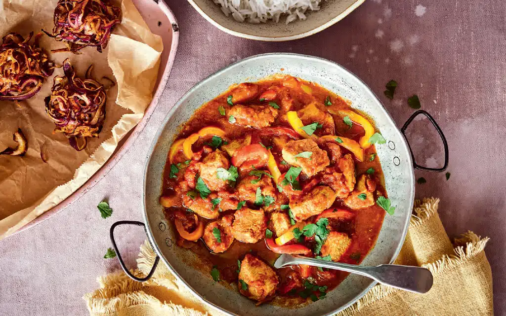 Започнете с пастата балти. Напръскайте тиган с нискокалоричен спрей за готвене и го загрейте на умерен огън. Добавете лука, джинджифила и чесъна и запържете за 3–4 минути, докато лукът стане златистокафяв.