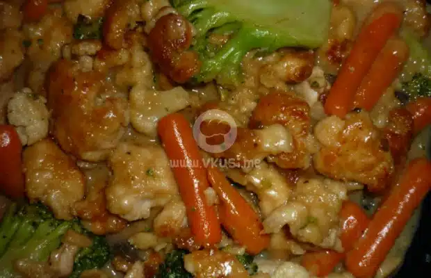 Измитите и нарязани зеленчуци се бланшират за няколко минути. Прехвърлят се, след като се отцедят при месото в тигана за няколко минути.