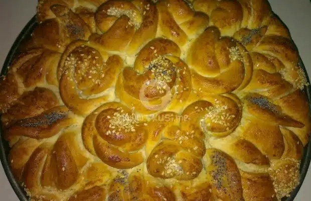 Оформянето е по желание. Аз разделих на 4 топки, три от тях разточих на кори с диаметъра на тавата, наложих ги една върху друга, като по между им ги намазах с масло. Разрязах на кръст, после и напречно. Получават се триъгълници, на всеки направих разрез по средата, като широката част остава цяла. Усуках двете части на всеки триъгълник навътре, а широката част промуших отвътре навън. После с другата (останала четвърта  част) от тестото направих топченцата отстрани, розите и листата.