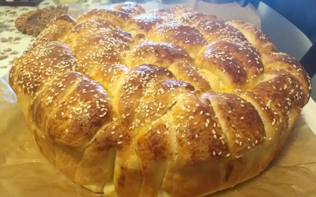 Оставя се да втаса около 3 часа, след което се маже с жълтък, разреден с олио или малко вода. Поръсваме със сусам и печем до готовност в предварително загрята фурна.