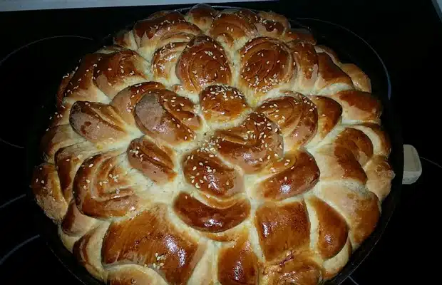Намазва се с жълтъка и се оставя да втаса отново за около 30 мин., след което се поръсва пожелание със сусам и се пече на 170 градуса около 50 мин.