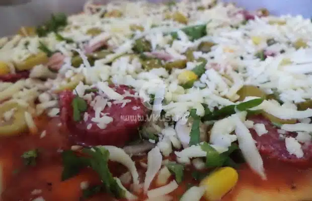 Получената пица печем в предварително загрята фурна на 240 градуса до готовност. Добър апетит ! 🙂